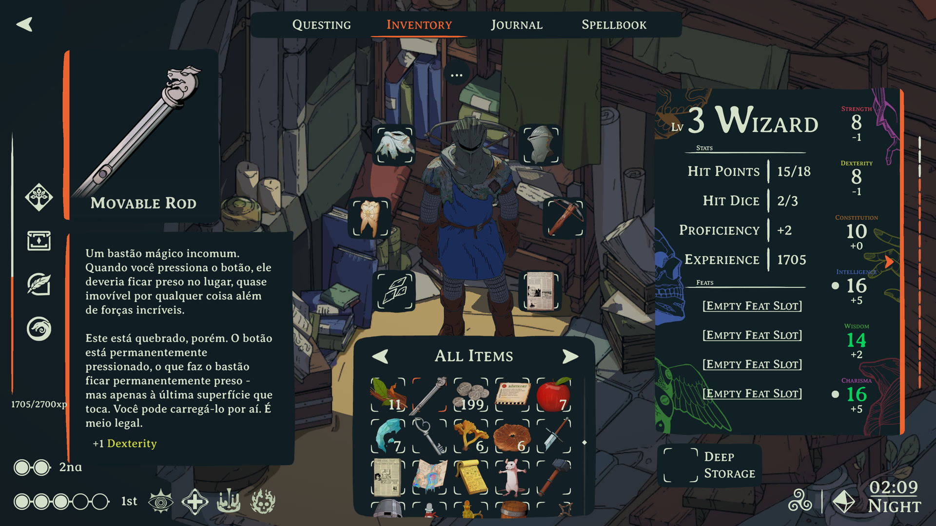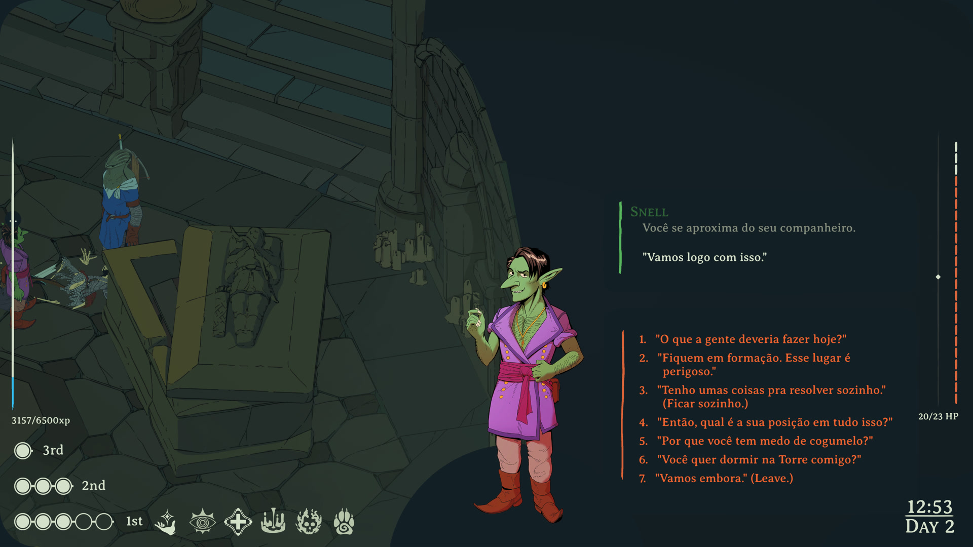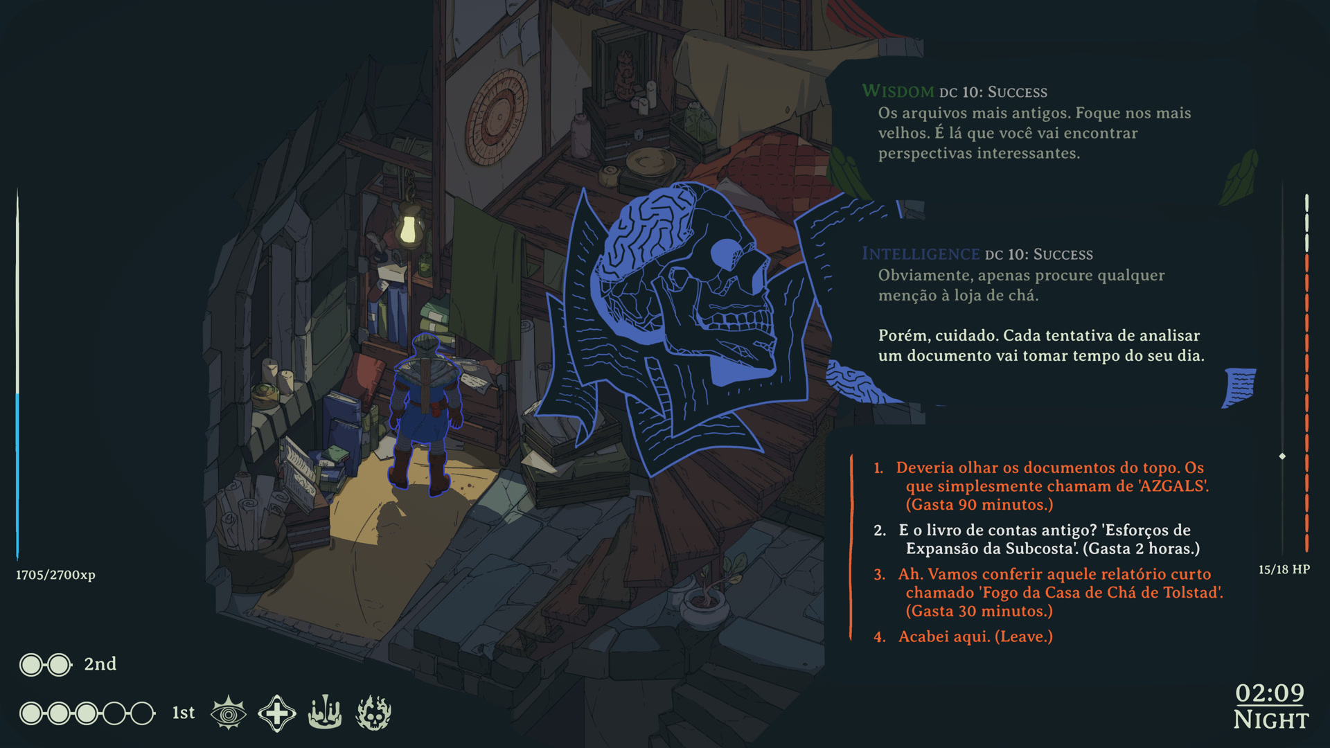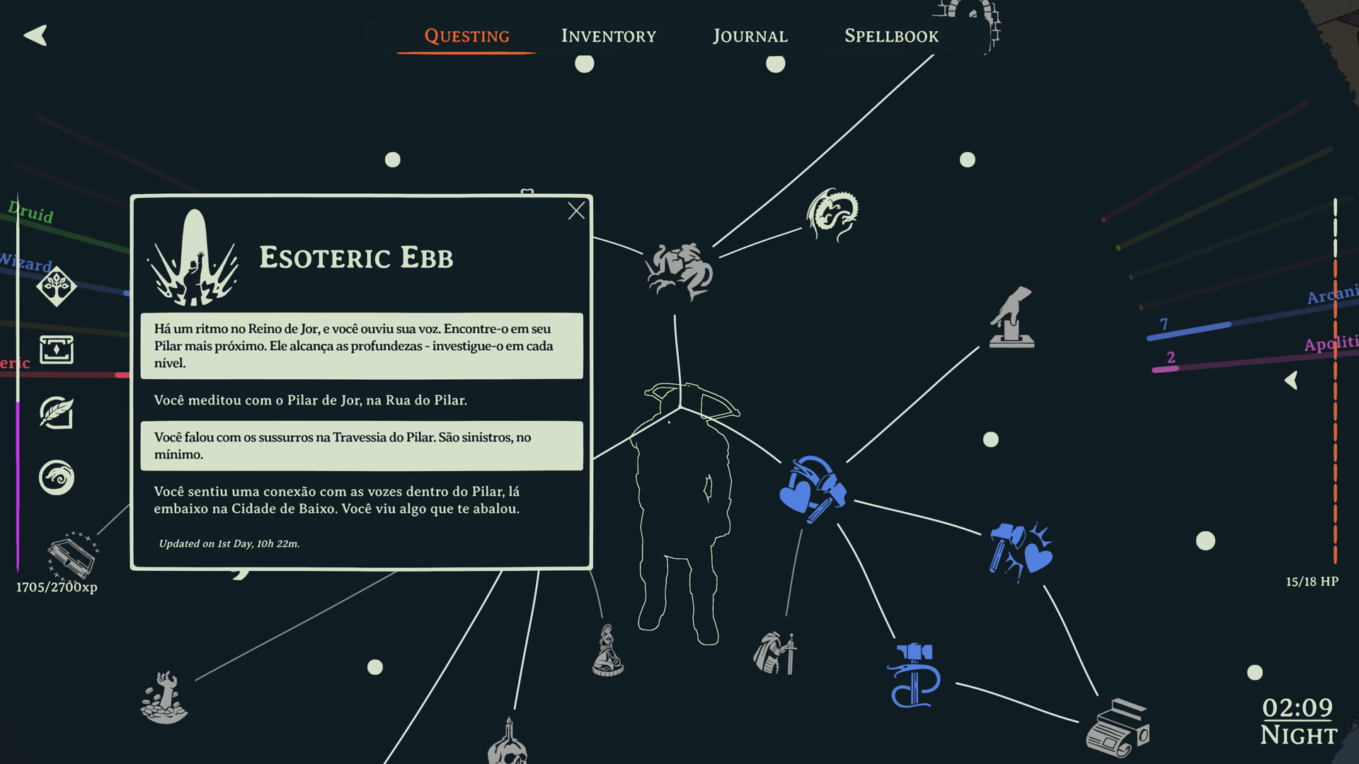 Esoteric Ebb é um RPG de fantasia sombria com um roteiro massivo — dezenas de milhares de linhas de diálogos e textos de escolha traduzíveis, além de milhares de strings de UI, entradas de lore, descrições de feitiços e entradas de diário de missões. O diálogo da história principal está essencialmente completo. Todas as missões principais, conversas com personagens e escolhas ramificadas foram traduzidas. O jogo é jogável em japonês do início ao fim.